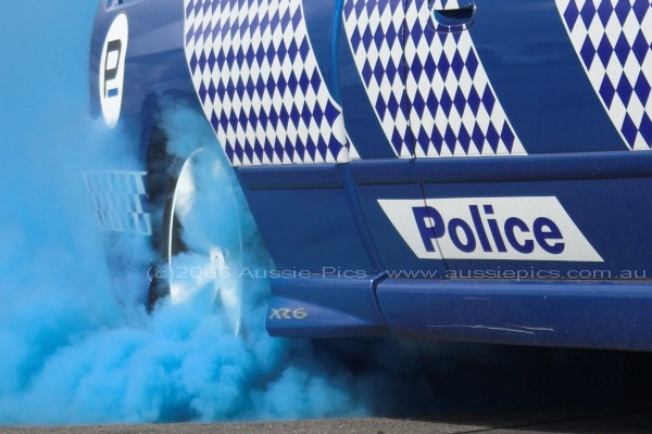 Following is a selection of images taken to promote the vehicle and it's message for "Operation Drag Right". Inspector Tim Peperkamp suited up [in V8 Supercars star Jason Bright's racing suit] and let loose. The blue clouds of smoke from the rear tyres are the result of special preparation using brand new techniques.